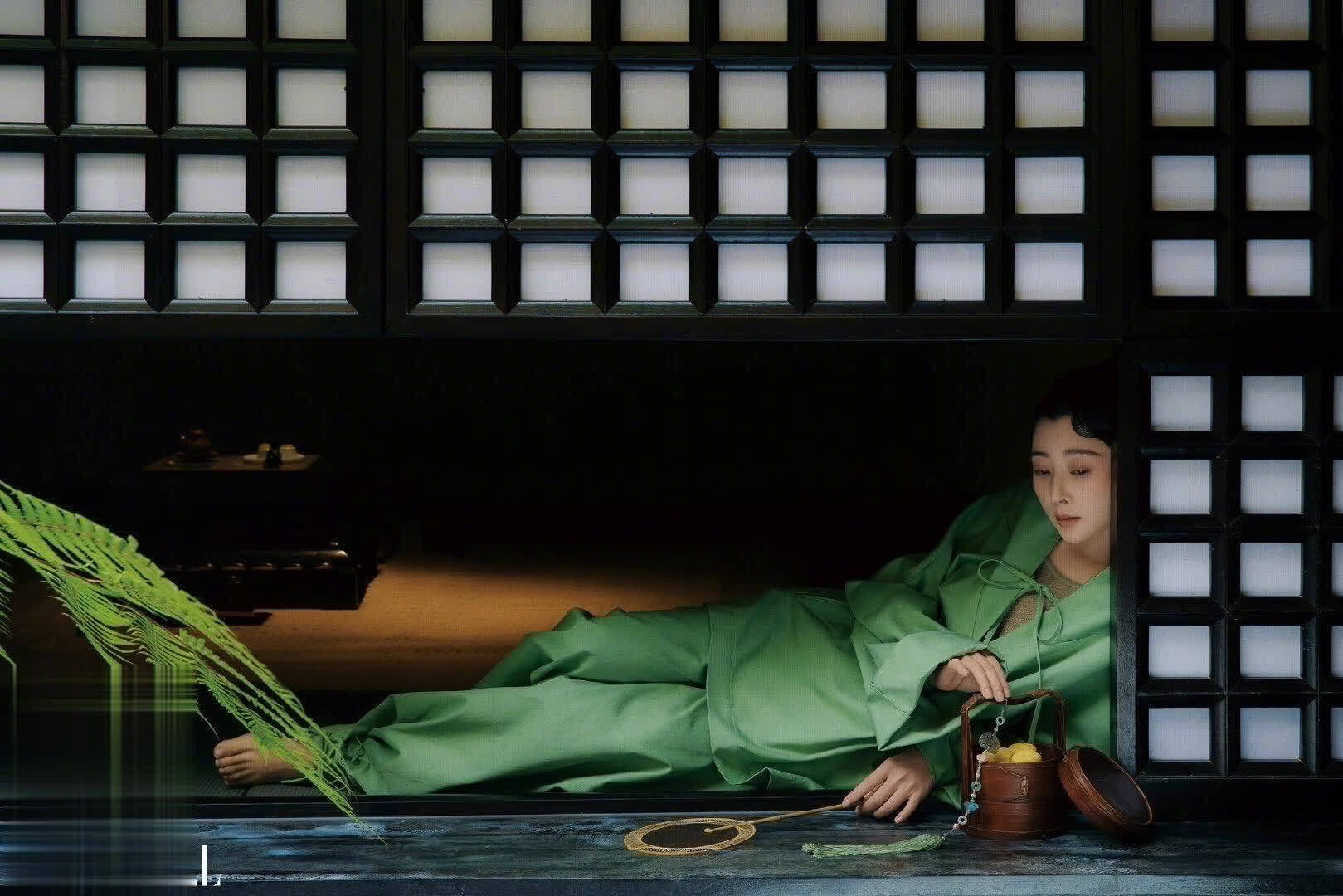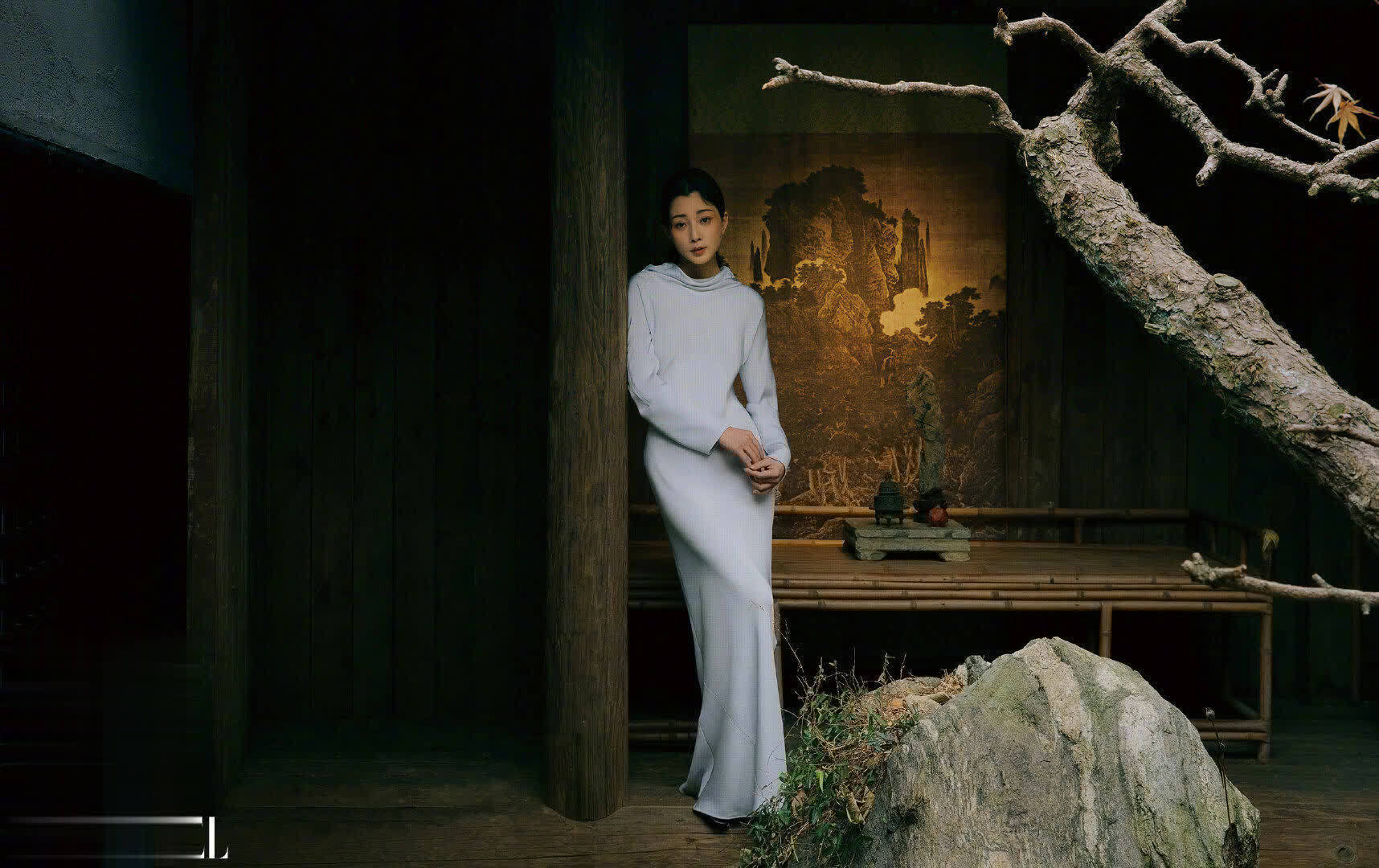 在这组封面中,殷桃以盘发的造型和细腻的妆容,展现了她温婉且从容的古典气质。她斜倚小窗,悠闲而慵懒的姿态充满了画中人的意蕴,仿佛从古代画卷中走出的美人。她的神情柔和而深邃,透出一份温润的气质,展现了国风美学中的精致与内敛。